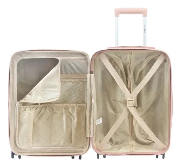 En su interior tiene, por un lado, un elástico para sujetar el equipaje, y del otro lado contiene un cierre con un bolsillo de red que funciona como tapa para separar tus pertenencias. Por fuera tiene un fuelle expansible, carro de aluminio interno y retráctil, y ruedas de silicona.