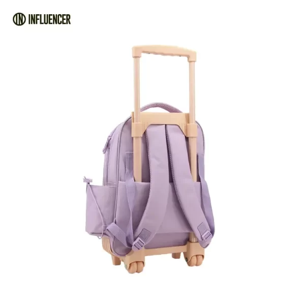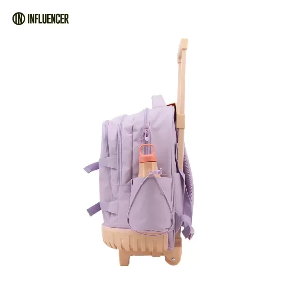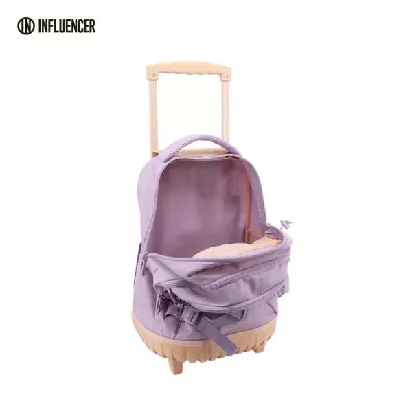 Mochila con carro INFLUENCER 18". Cuenta con 1 compartimientos principal y 2 más pequeños frontales. Además posee un bolsillo lateral porta botella. Su carro es reforzado con doble rueda de cada lado.